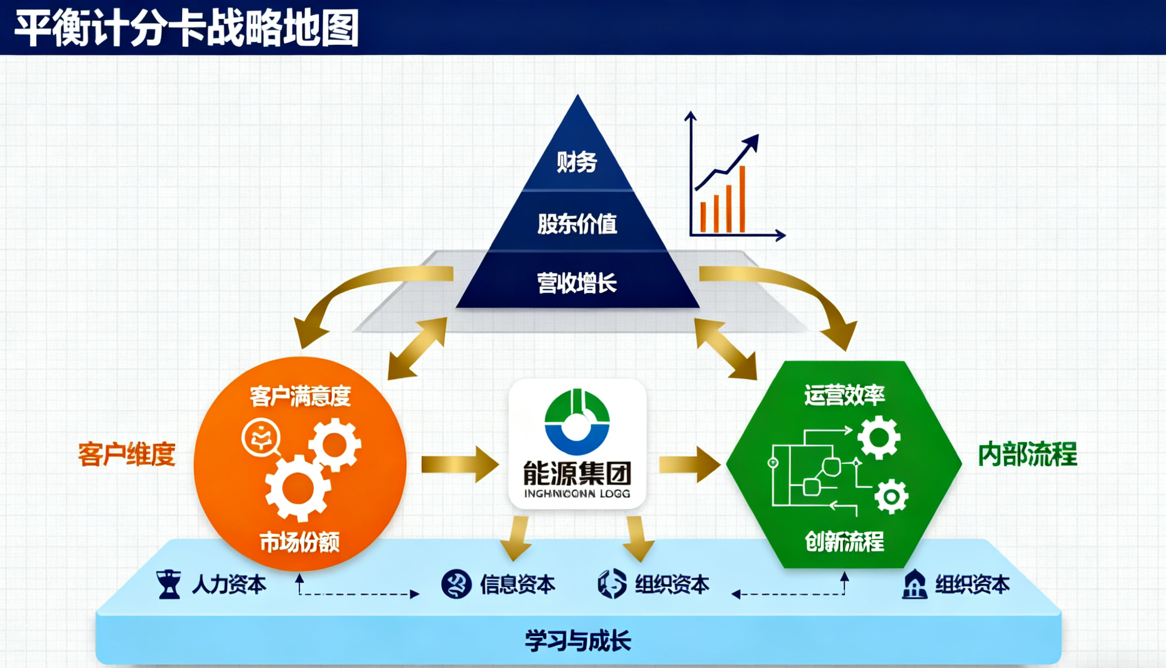 帮助某大型能源集团构建战略地图和平衡计分卡体系,实现战略可视化和多维度绩效监控。