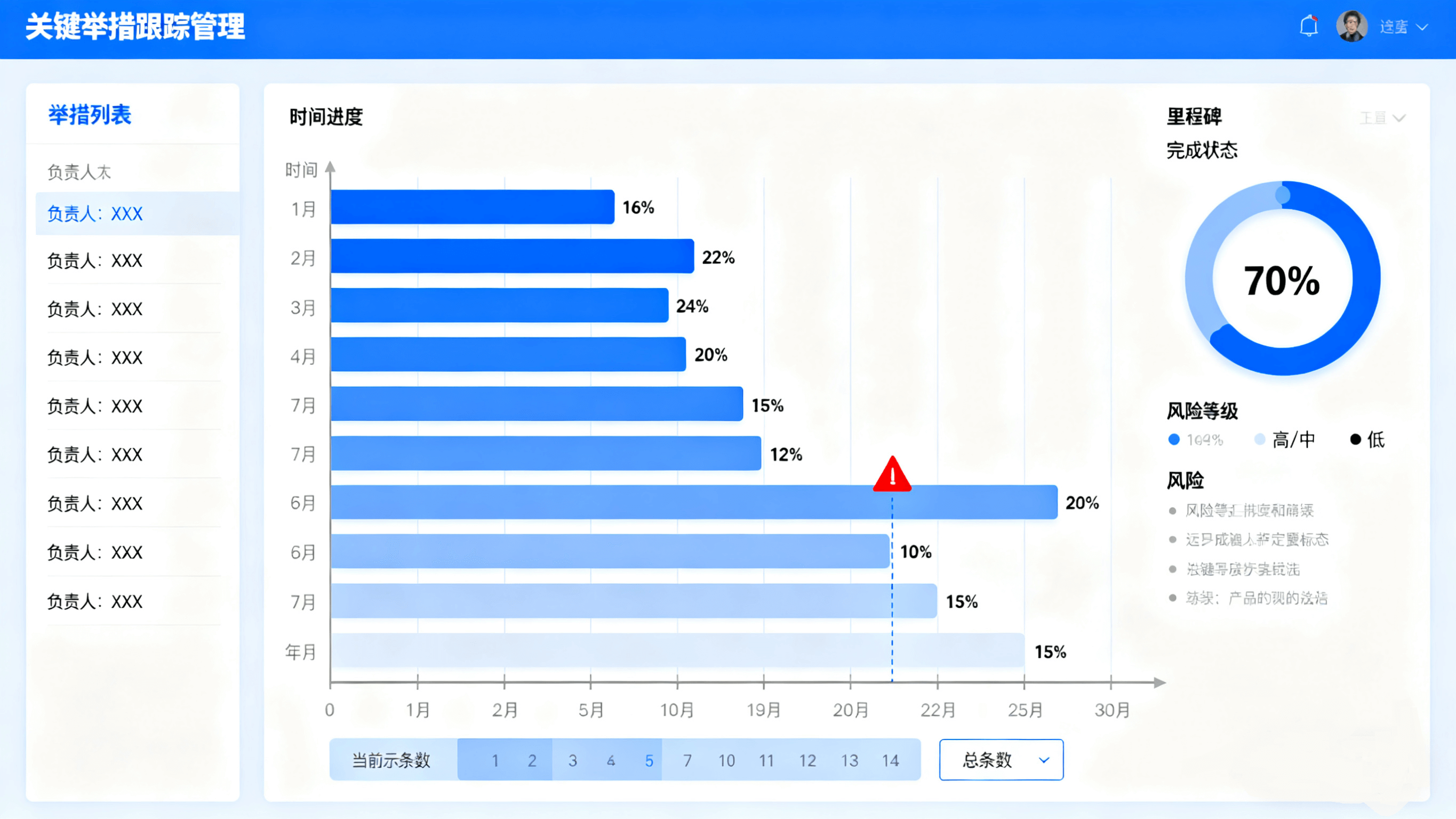 将战略目标分解为具体的关键举措,明确责任部门、负责人和时间节点,实时跟踪每项举措的执行进度。