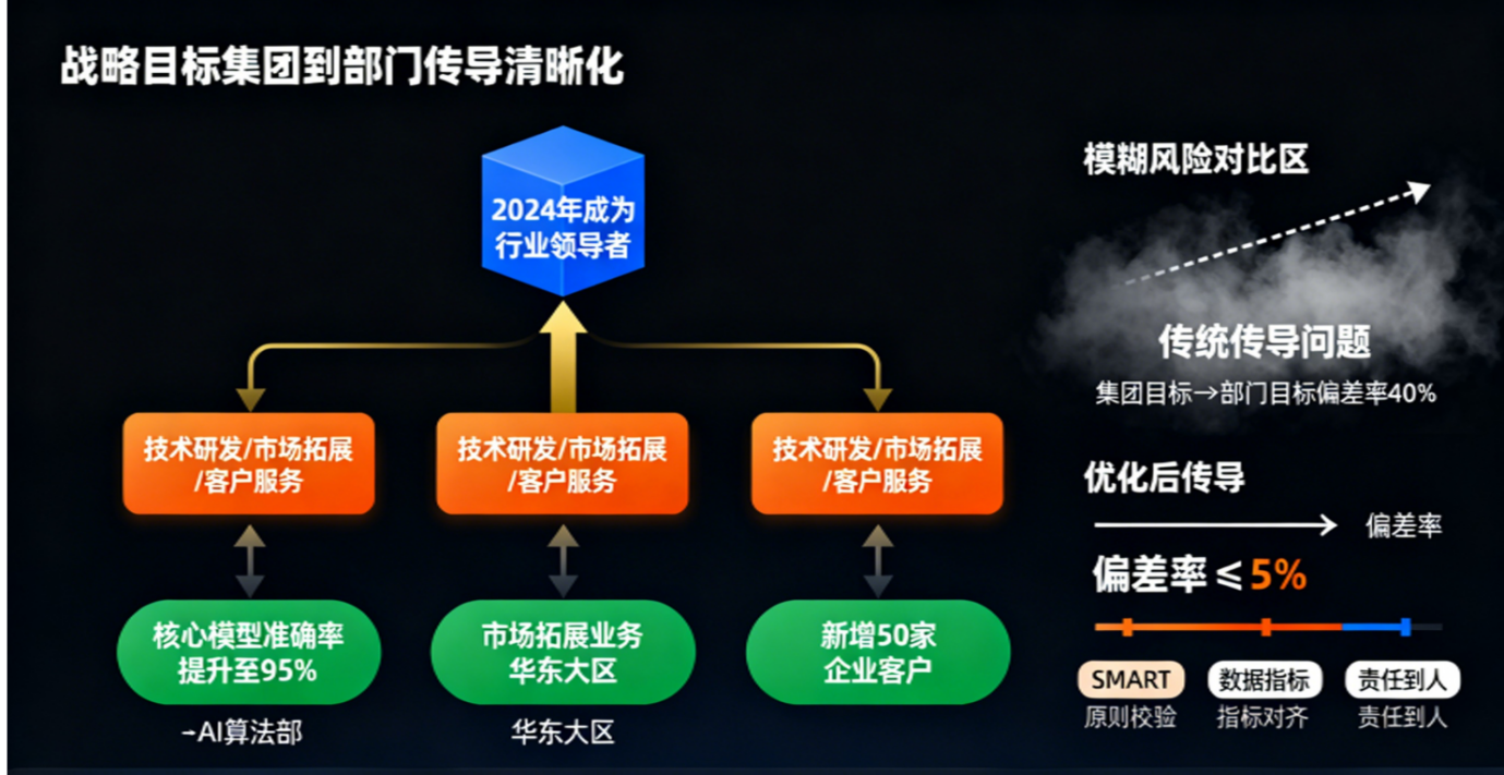 通过“战略拆解矩阵”工具,将集团目标逐层分解至部门及个人,明确每个任务的“责任人、截止时间和衡量标准”。以某集团“年营收增长20%”的目标为例,系统将其拆解为: